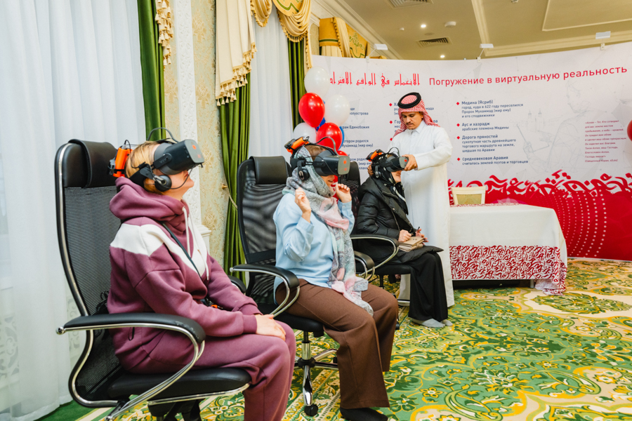 Күргәзмәгә килгән кешеләр виртуаль чынбарлык дөньясына күз салу мөмкинлеге бирә торган колакчынлы күзлек киеп, үзләрен мөселманнар өчен изге урында булган кебек хис итә алды.