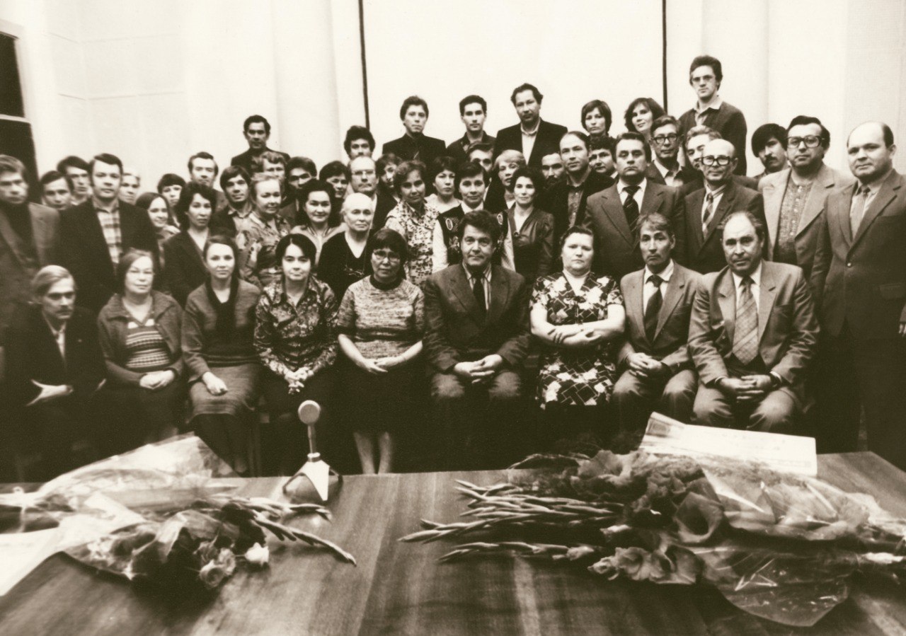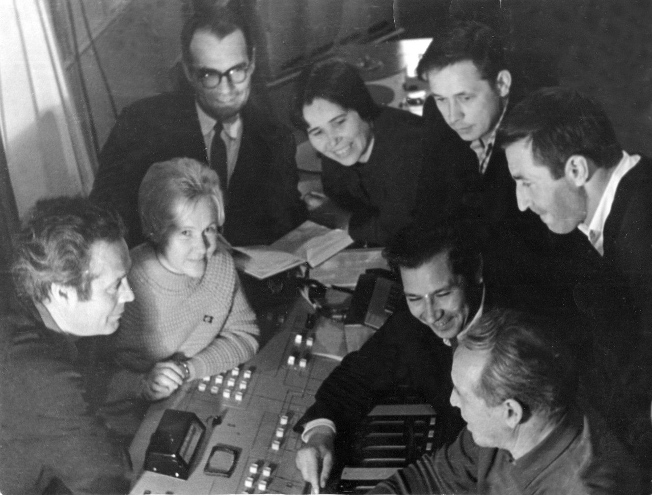 Илһам учагы тирәсендә. Празат Исәнбәт, Клара Таҗиева, Госман Әхмәтҗан, Нәсимә Әхмәтҗанова, Рим Шириязданов, Әсфән Ильясов, Рим Кәримов, Исмай Шәмсетдинов. 1970 ел, сентябрь.