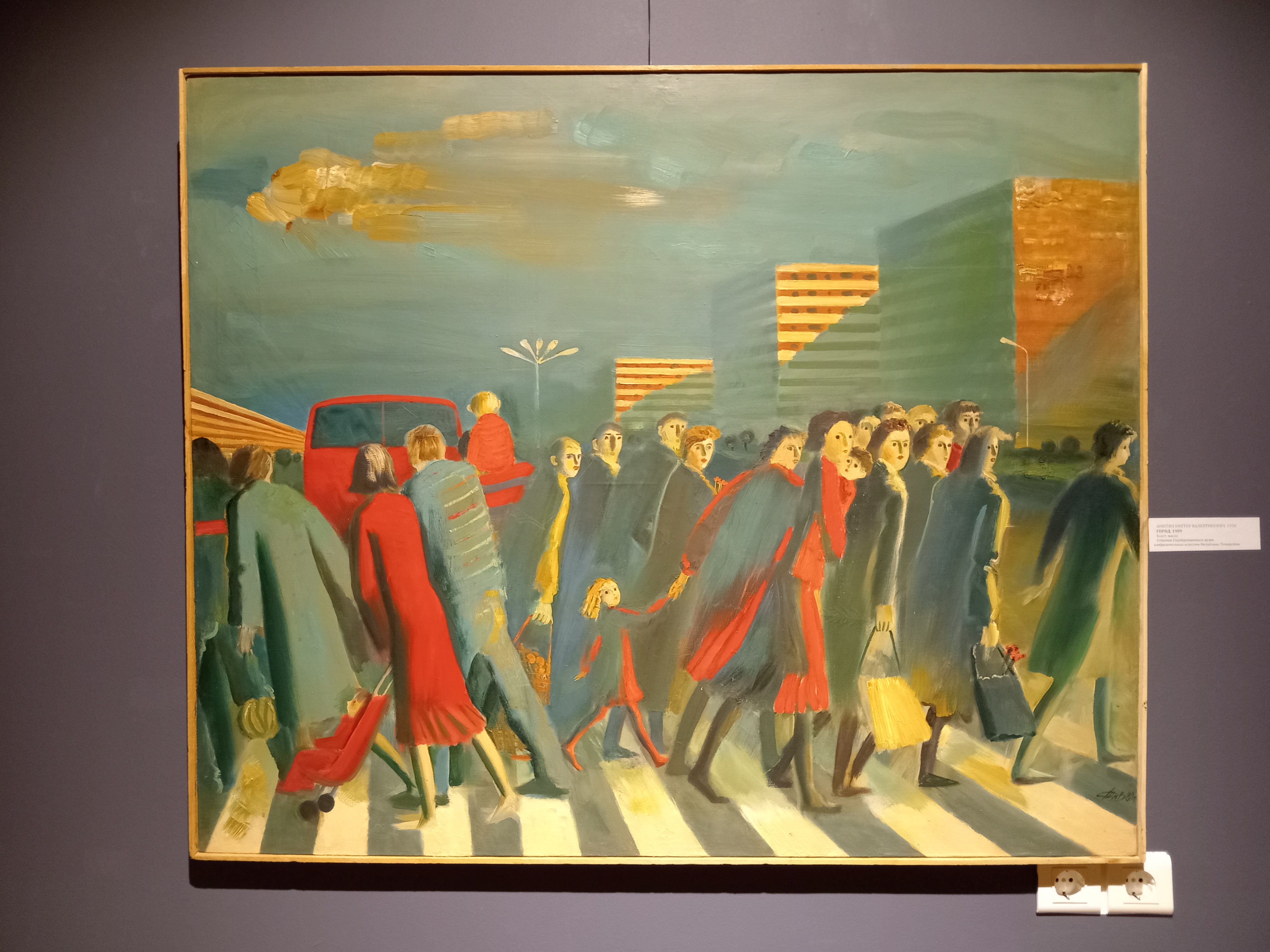 Авылны сурәтләве үзенә бер хикмәт булса, шәһәр күренешләре тагын гаҗәпкә калдыра. Кискен төсләр, саран чаралар белән кешеләрнең тыз-быз анда-монда йөрүен күрсәтеп нәрсә әйтергә теләгән икән ул? «Шәһәр» дип исемләнгән шундый бер картинада беренче итеп кая карарга белмисең, төп герой юк кебек. Төп герой – үзәк идея, беренчел фикер, дибез икән, аның юклыгы картинада тыз-быз йөренгән кешеләрнең тормышында мәгънә юклыгын аңлатадыр, бәлки.