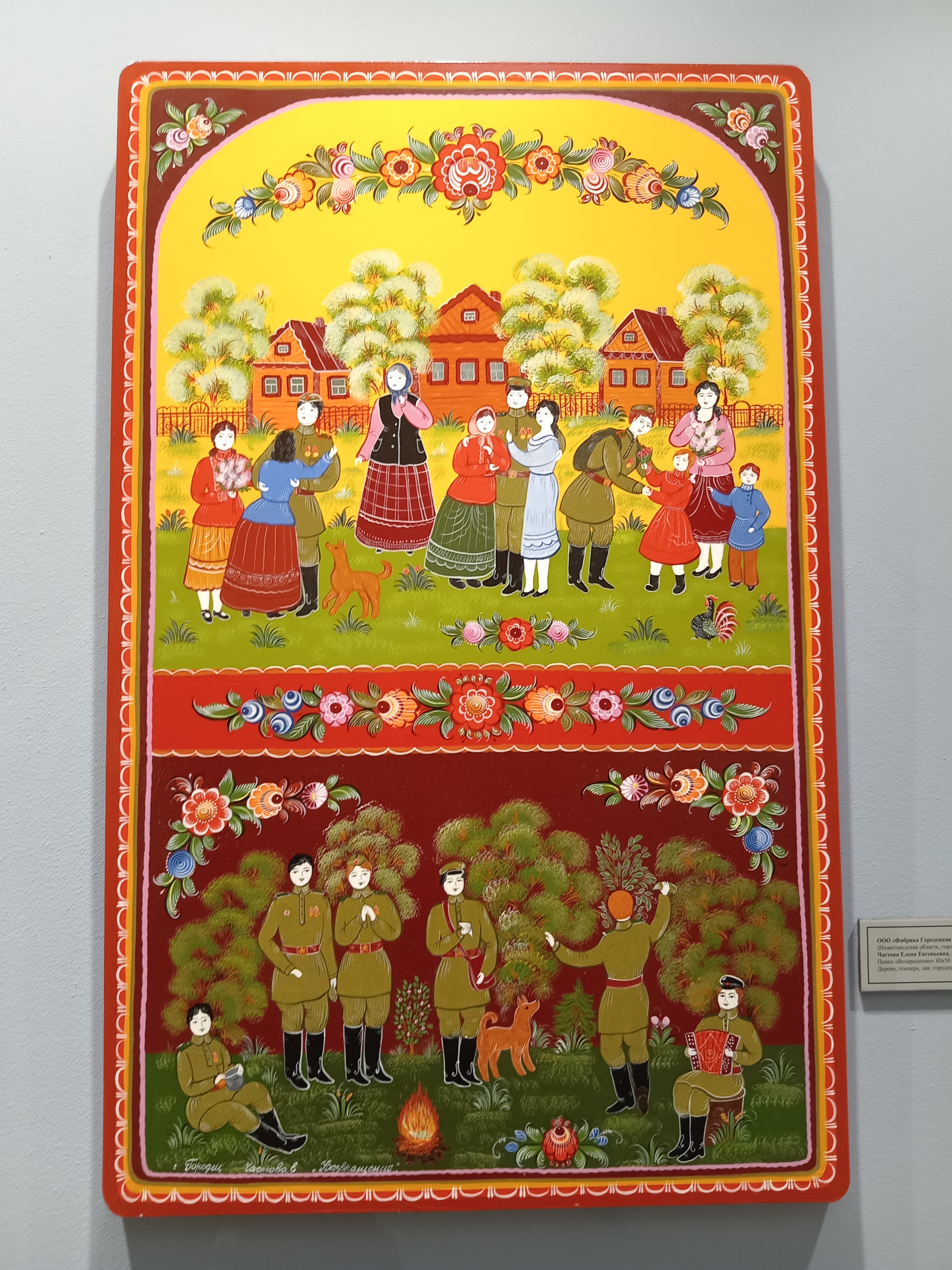 Хохлома рәсемнәрен күрмәсәк, йөрәккә нидер җитми калган кебек булыр иде. Бәхеткә, данлыклы бу сәнгать төрен дә тәкъдим иткәннәр. Әмма элеккечә чәчәкле-чуклы түгел ул монда. Бер тәлинкәдә – бозланып каткан Ленинград шәһәре. Блокада. Сурәттә бер җан әсәре юк. Янәшәдәге тәлинкәләрнең берсендә исә Рейхстаг бинасына Җиңү байрагы алып менгәннәр.